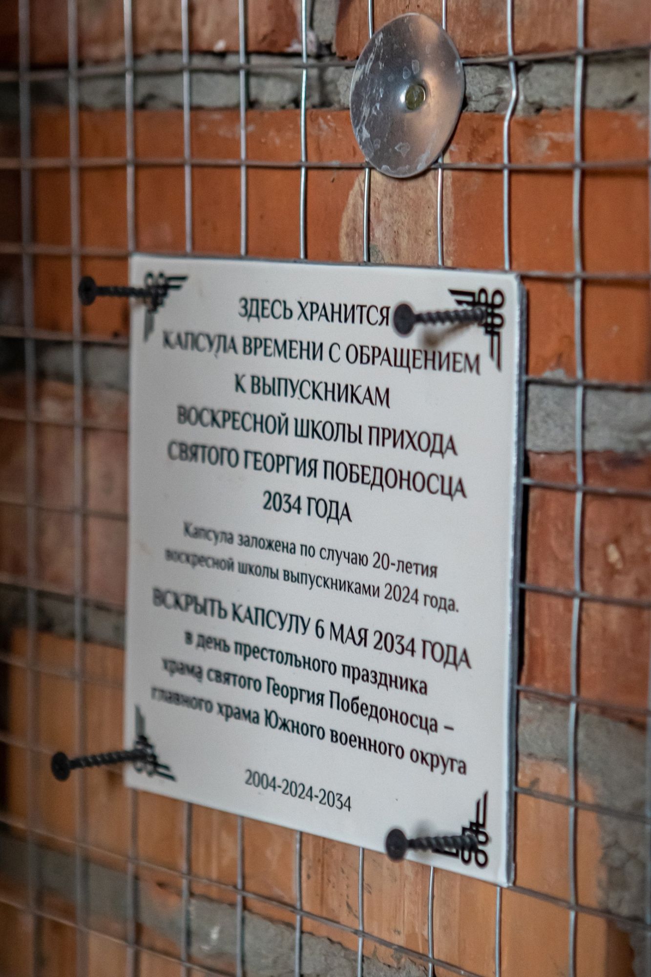 Во главе с настоятелем прихода отцом Валерием и директором школы матушкой Ксенией педагоги выпускной группы и сами воспитанники торжественного заложили капсулу в стену строящего храма святого Георгия Победоносца с наказом вскрыть её через 10 лет!