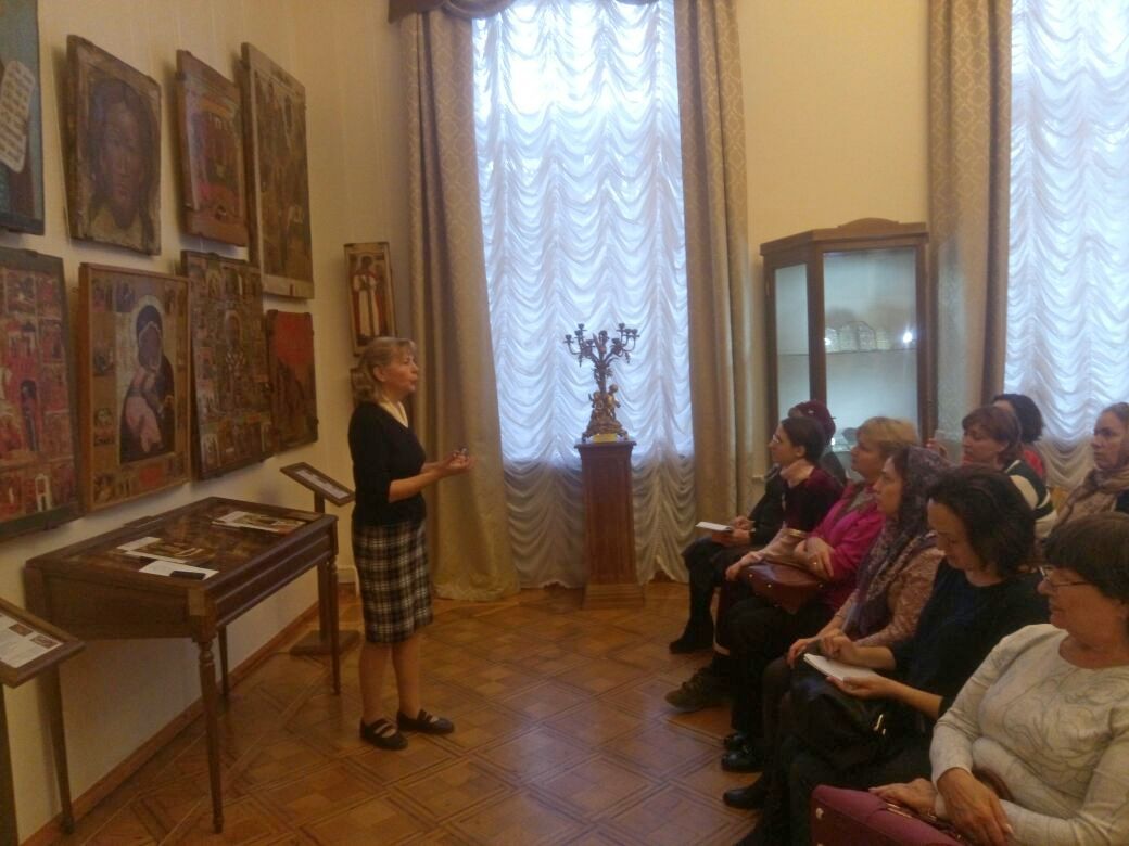 6 ноября 2017 года мастерицы и ученицы курсов золотошвейной мастерской св. пр. Тавифы посетили лекторий в Музее изобразительных искусств, который провела Антонина Арсеньевна Нарыжная. Тема лектория: «Древнерусское искусство. Иконография православной иконы». Мы с интересом узнали об истории иконы, ее символизме, цветовом каноне, об особо почитаемых на Дону святых, о степенях духовного развития человека. После лектория Антонина Арсеньевна показала небольшую экспозицию, представляющую собрание фарфора XIX-XX веков.