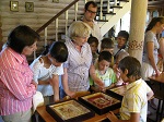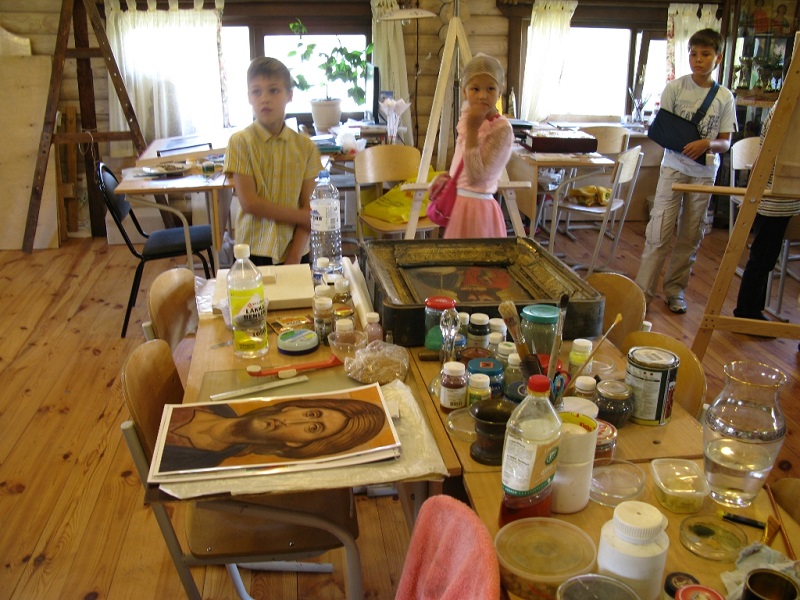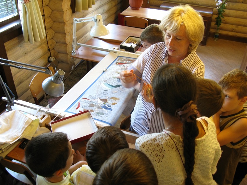 Руководитель золотошвейной мастерской Елена Жилинская познакомила гостей с техниками и материалами, используемыми в золотном шитье, показала выполненные приходскими мастерами изделия. Также ребятам были продемонстрированы традиционные тряпичные куклы, изготовленные умельцами прихода. Встреча завершилась посещением иконописной мастерской, знакомством с техникой написания икон и используемыми материалами.