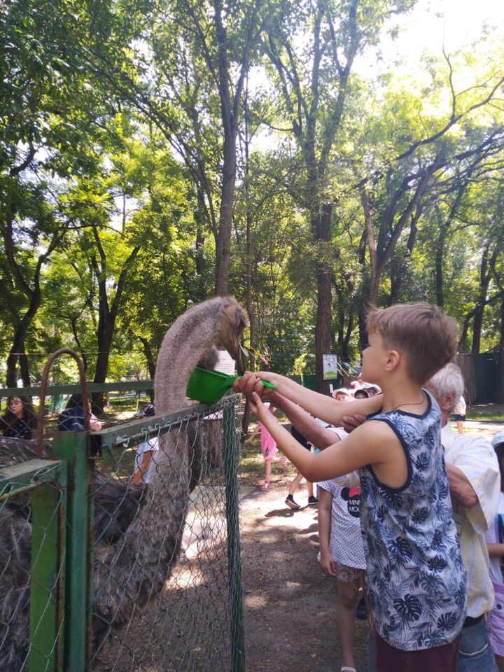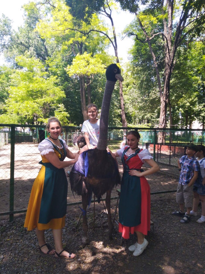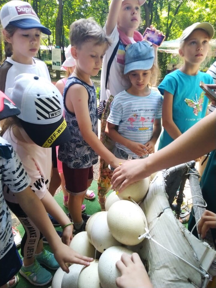 Утром ребята отправились на экскурсию на настоящую страусиную ферму. В интересной игровой форме они узнали много интересного из жизни страусов, поучаствовали в весёлых состязаниях и поиграли в гигантский Твистер. Потом все дружно кормили страусов.