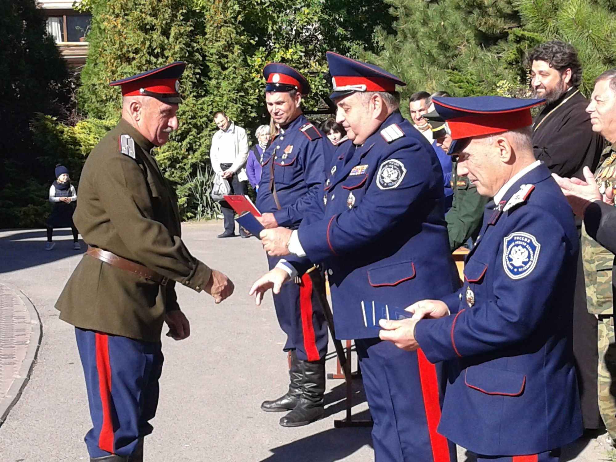 По поручению атамана Всевеликого войска Донского казачьего генерала Гончарова В.Г. председателю Центра сотнику Чуцкову В.И., начальнику штаба Центра подхорунжему Сомову Д.В., помощнику начальника штаба Центра старшему уряднику Руденко С.В., командиру детско-юношеской сотни подхорунжему Погодину В.В. полковник Момот Г.В. вручил удостоверения казака, утверждённые Указом Президента Российской Федерации.
