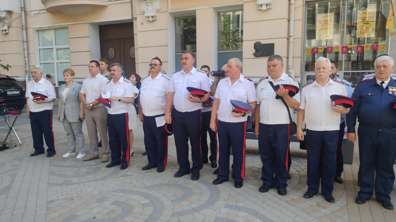 На мероприятии присутствовали атаманы воиска Донского, казачий полковник Могильный В.Н. первый товарищ атамана Ростовского казачьего округа войсковой старшина Силантьев А.С. первый товарищ атамана войска директор ГКУ РО "Казаки Дона" атаман ГКО "Ростовское" командир дружины Ростова-на-Дону Тупалов А.П. Также в мероприятии принял участие член совета стариков Шевченко Н.В., представитель Кировской администрации, заместитель начальника управления по делам национальностей, религии и казачеству администрации города Зонов И.В.