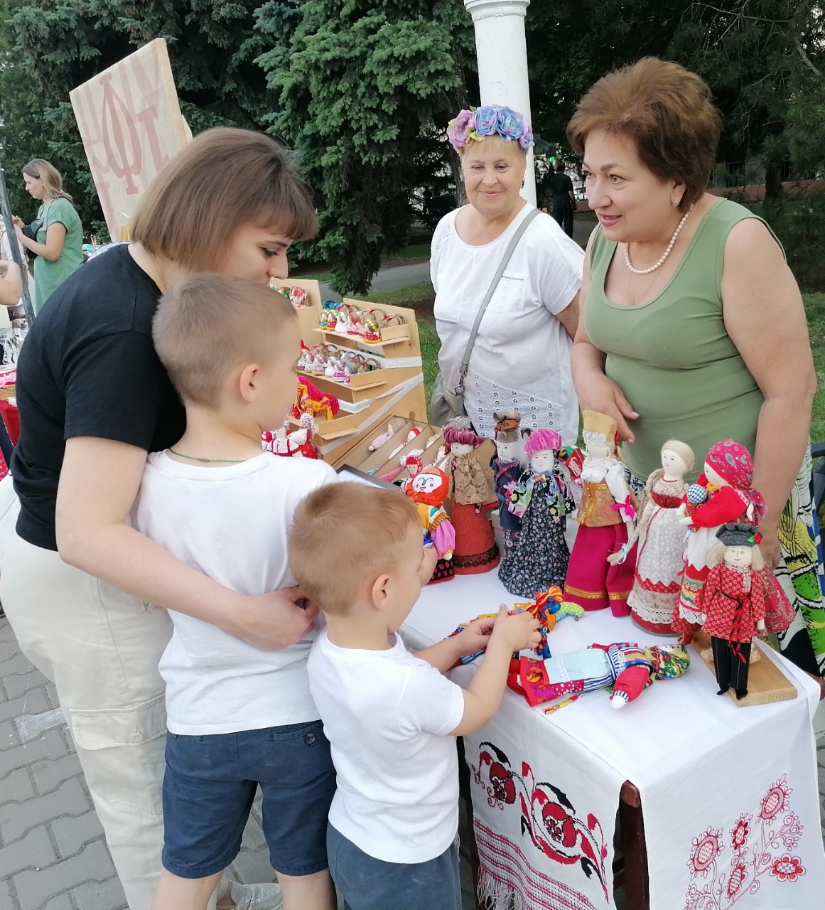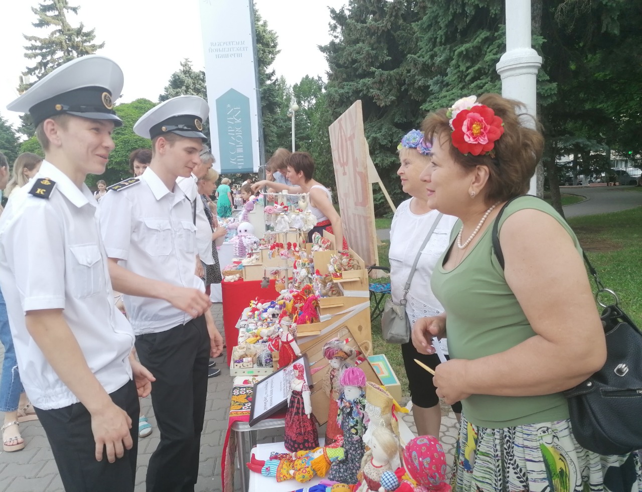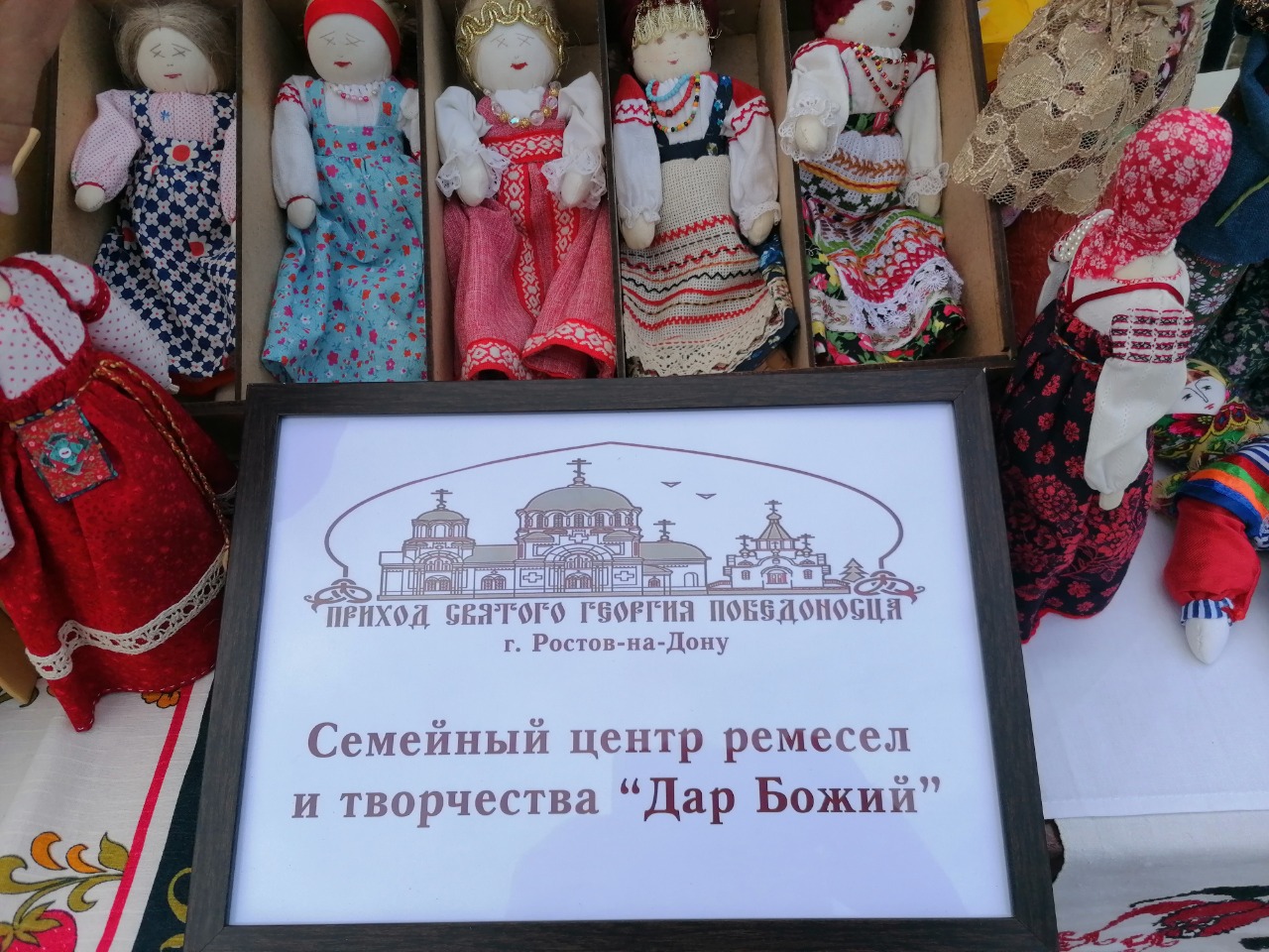 Окаймляла Фонтанную площадь экспозиция народных ремесел петровской эпохи. Среди творений кузнецов, гончаров, мастеров деревообработки и лозоплетения почетное место занимала выставка кукол от Семейного центра мастерства и творчества «Дар Божий», ведущего свою творческую деятельность при приходе святого Георгия Победоносца (руководитель Наталья Павловна Матвеева).