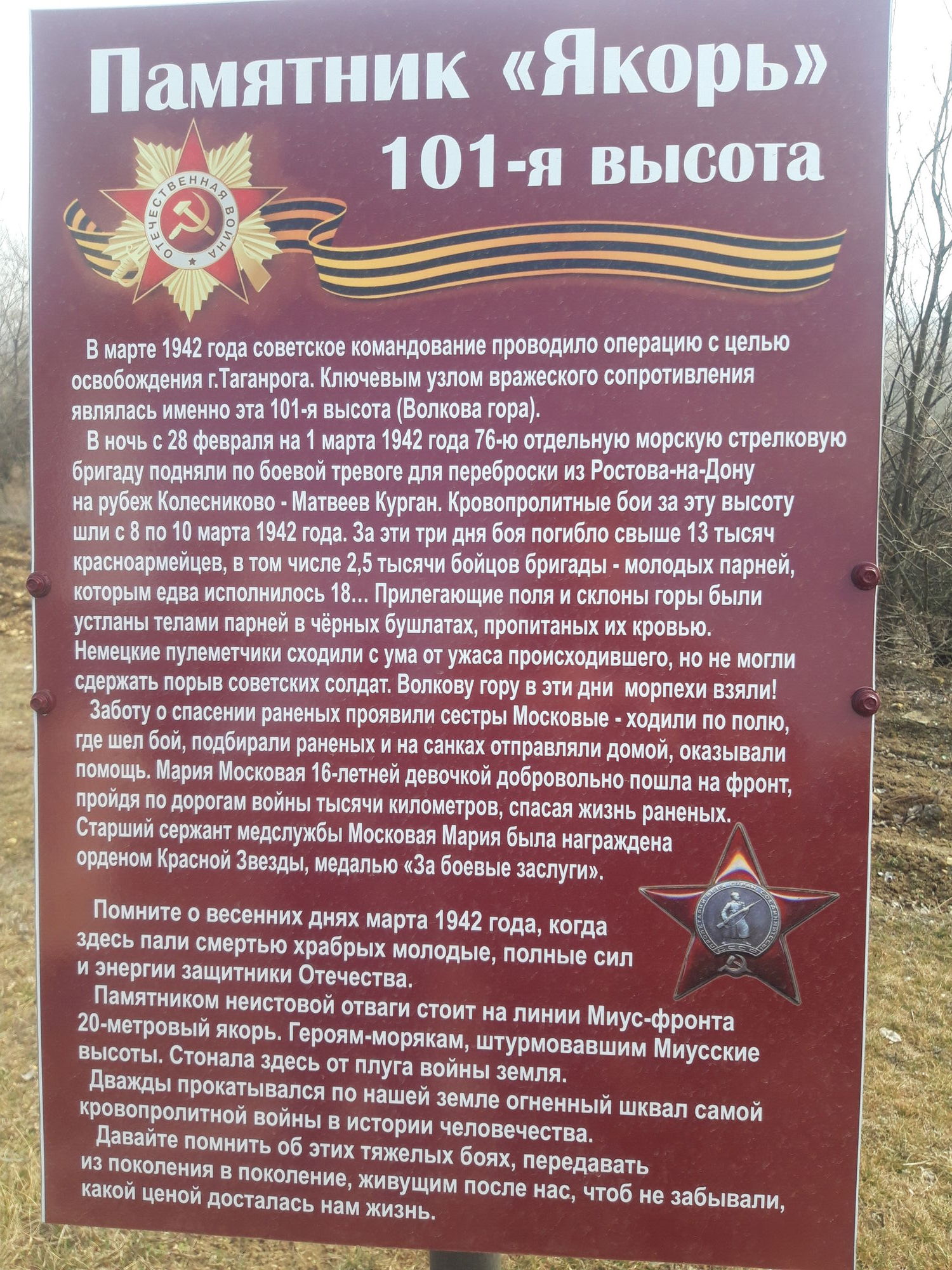 В марте 1942 года в районе высоты 101 «Волкова гора» Матвеево-Курганского района вели наступательные бои по освобождению Ростовской области от немецко-фашистских захватчиков воины 81-й, 76-й и 68-й морских стрелковых бригад, 30-й, 347-й, 2-й стрелковых дивизий и 63-й отдельной танковой бригады. За время наступательных мартовских боев 1942 года эти воинские части понесли серьезные потери. Около 13 тысяч бойцов и командиров погибли за освобождение Донской земли.