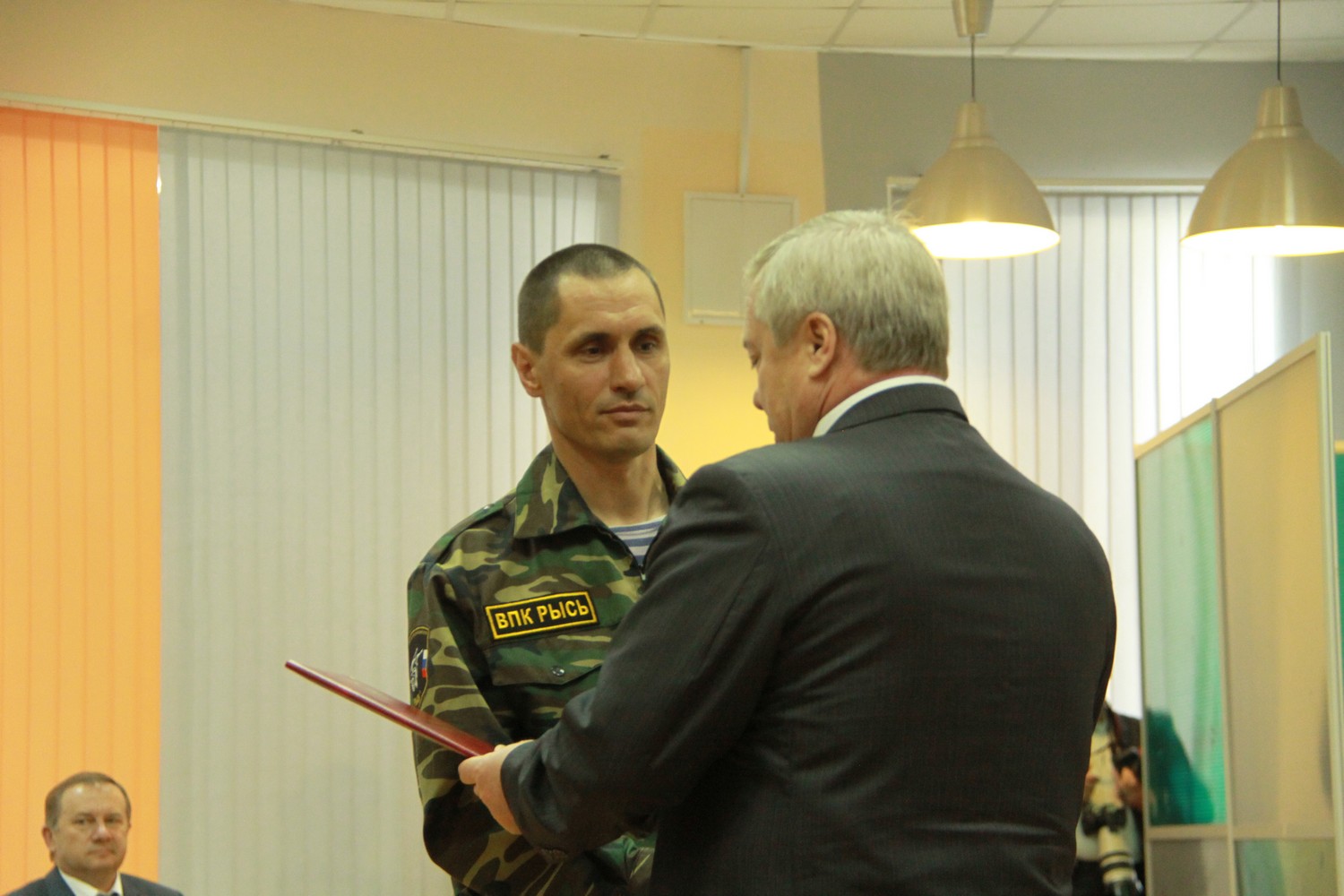 Василий Юрьевич поблагодарил всех собравшихся за активную общественную военно-патриотическую деятельность, многие руководители были награждены. Представителям нашего центра: Кудрякову Андрею Юрьевичу(руководитель поискового объединения «Миус Фронт») и Жукову Александру Леонидовичу (руководитель поискового клуба» Рысь») были вручены благодарственные письма от имени Губернатора Ростовской Области. Представитель отдела по взаимоотношениям церкви и общества Ростовской-на-Дону Епархии, председатель Ростовского духовно-патриотического центра Святого Георгия Победоносца Чуцков Виктор Иванович был награжден грамотой Президента Российской Федерации Путина Владимира Владимировича и памятной медалью «70 лет Победы» Российского Оргкомитета «Победа».