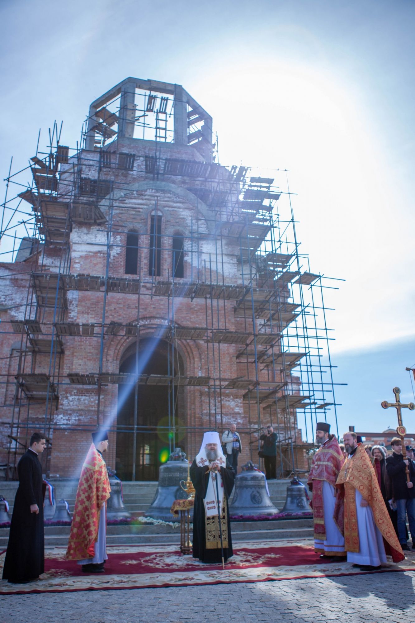 И вот, неслучайно в этот день, накануне дня 77-летия Великой Победы, мы освящаем эти колокола. Колокол - это метафорическое сердце народа, его душа, народная память. А нашему народу есть, что вспомнить: прекрасные и славные страницы своей истории, своих побед и свершений. Особенно значимо то, что в сооружении этих колоколов принимал участие весь личный состав Южного военного округа. Наши ребята, оставаясь верными воинской присяге, призванию, долгу и зову своего сердца, встали на защиту своего Отечества и продолжают то дело, которое совершали наши великие предки в 41-45-м годах, воздвизаясь во весь рост на борьбу с фашизмом и гитлеровским нацизмом. Наши сегодняшние соотечественники совершают такое же великое дело, в эту самую минуту защищая интересы страны. Поэтому наша молитва - о всех наших доблестных воинах, рядовых, офицерах, генералах - о всех тех, кто полагает "душу свою за други своя" (Ин., 15:13).