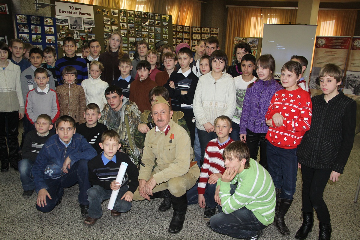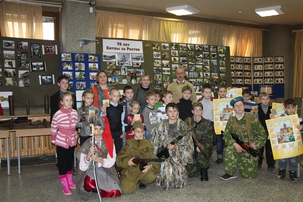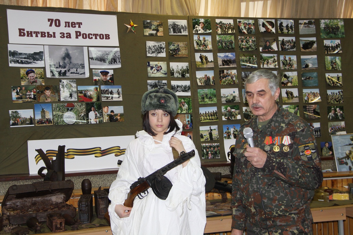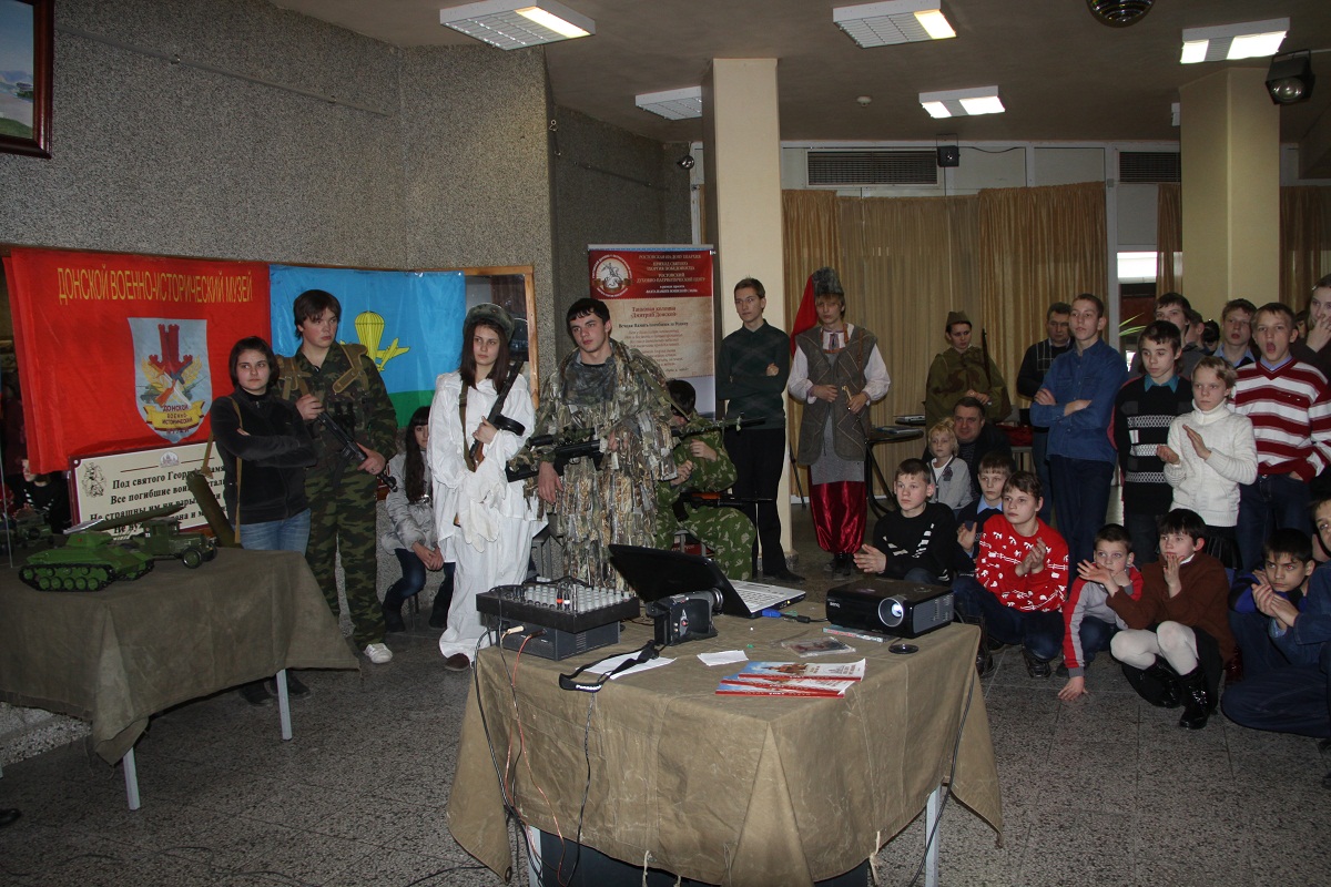 Председатель Ростовского духовно-патриотического центра Святого Георгия Победоносца Виктор Чуцков выступил с авторской песенно-поэтической программой и провёл для детей урок мужества, на котором рассказал о важнейших событиях военной истории России и о службе в современной армии.