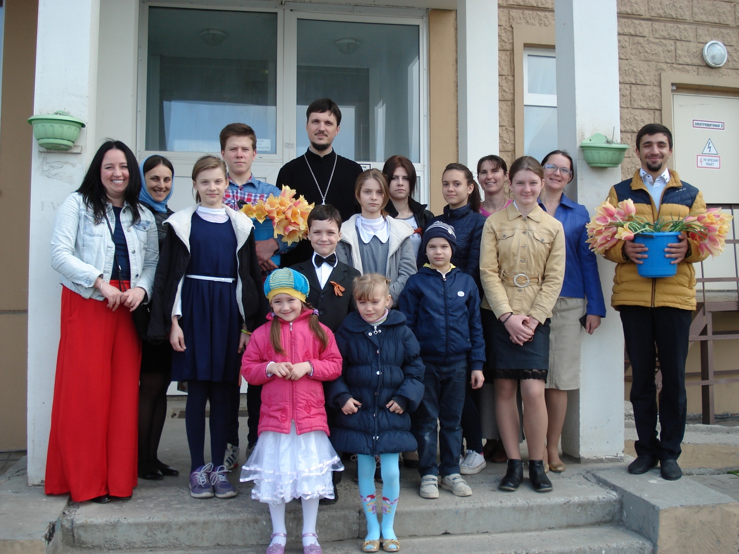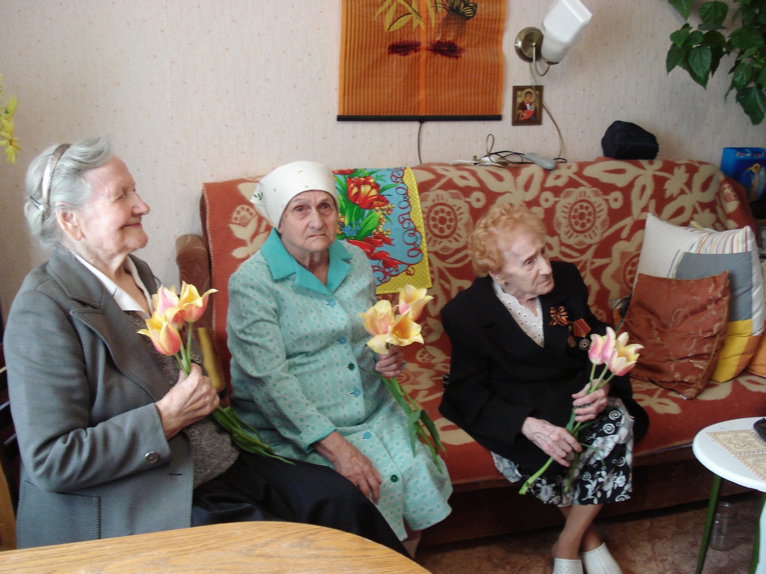 В теплой домашней обстановке за чаепитием прошла встреча с ветеранами, дети из воскресной школы пели песни военных лет, читали стихи, ветераны с трудом сдерживали слезы... Наша молодежь поблагодарила участников войны за их великий подвиг, который они совершили во имя светлого будущего. Каждому из них были подарены подарки и цветы, а также то внимание и любовь, в котором они так нуждаются. В конце было совместное фото на память... Не забыли никого... посетили всех... А тем, кто по каким-то причинам не смог открыть двери, просто оставляли цветы...