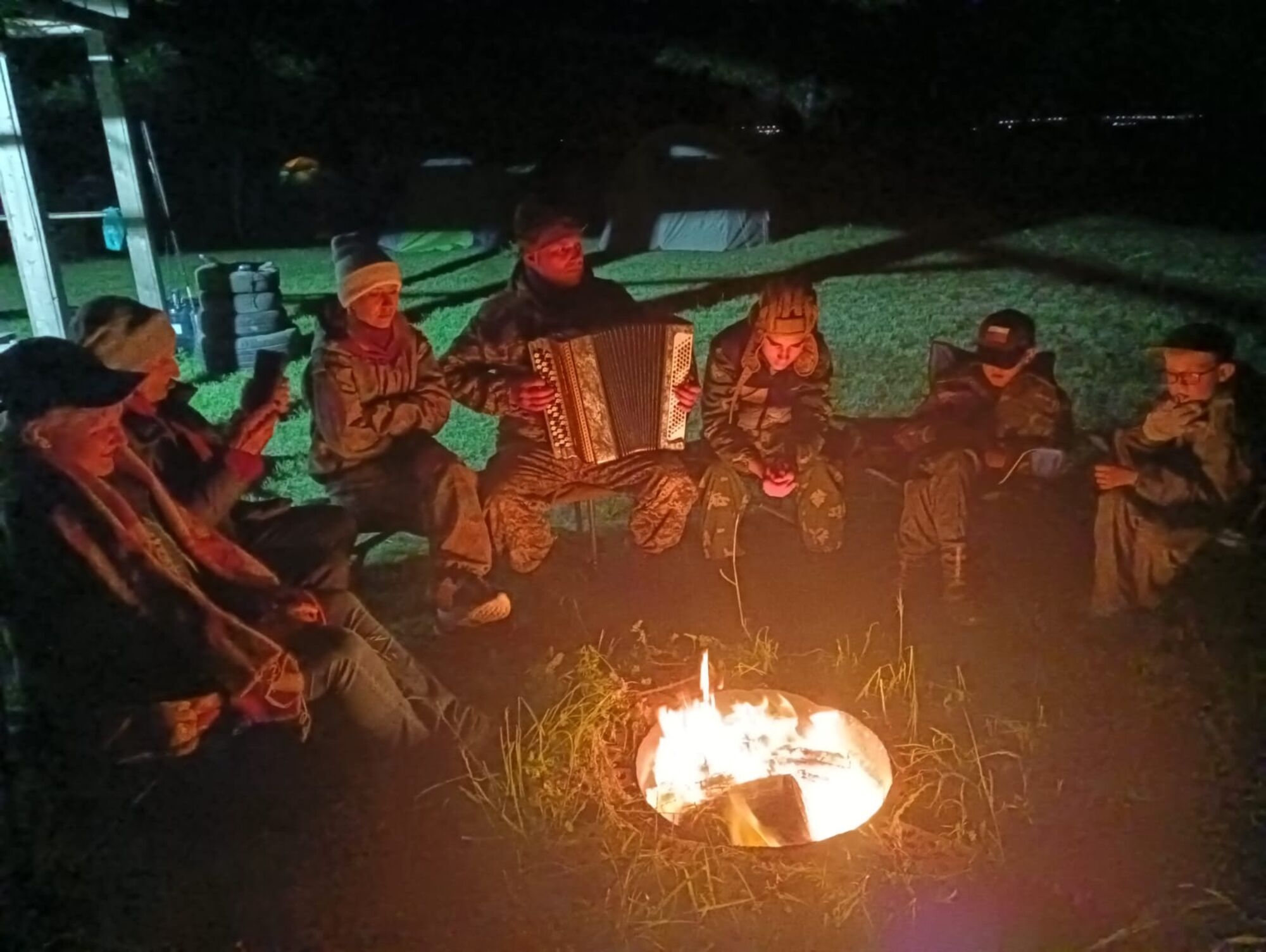 Родители и инструкторы приготовили выловленную кадетами рыбу, сварили походный суп с мясом и овощами. У ночного костра, у берега реки, под баян и гитару звучали казачьи песни и песни великой Победы!