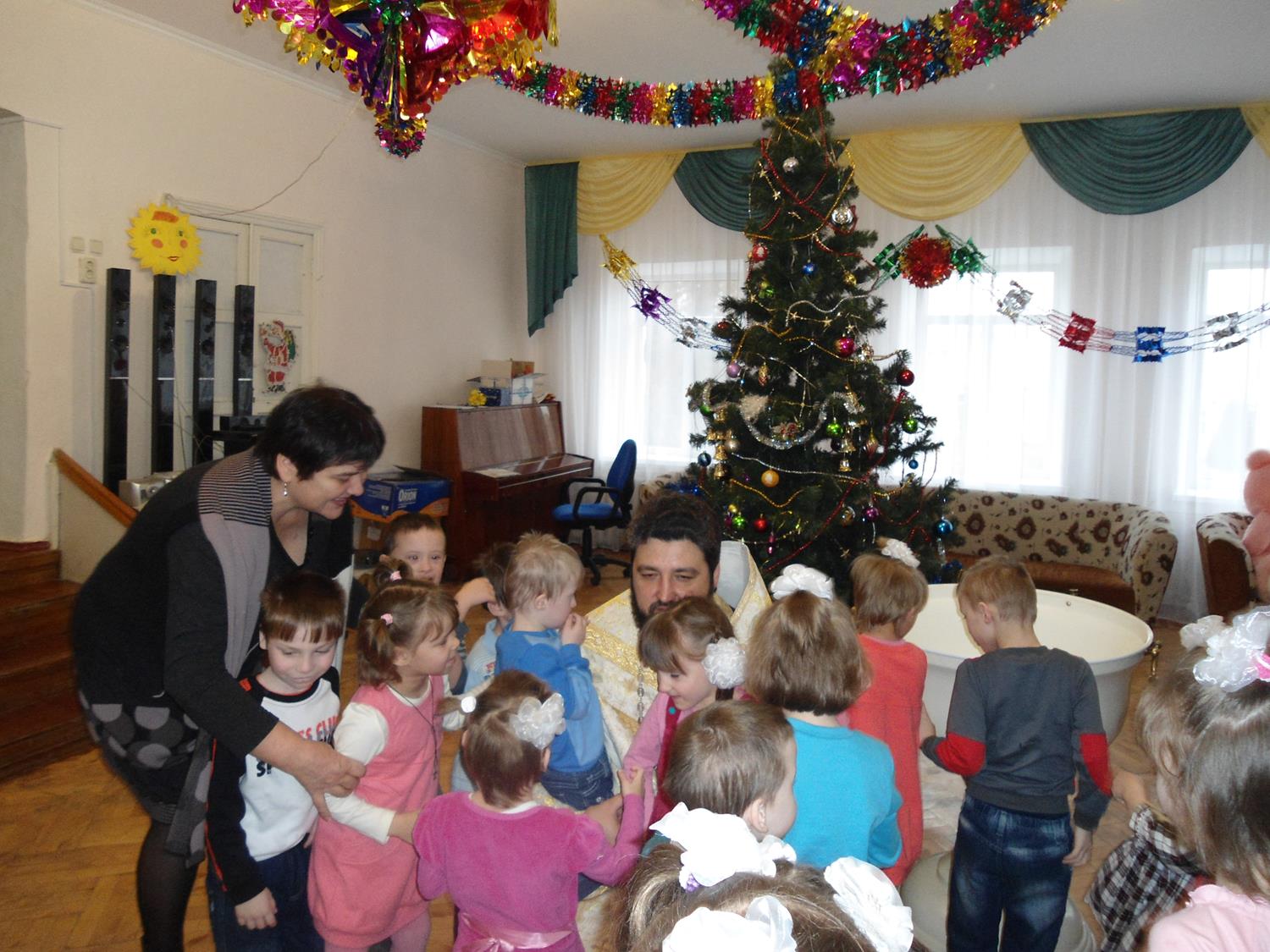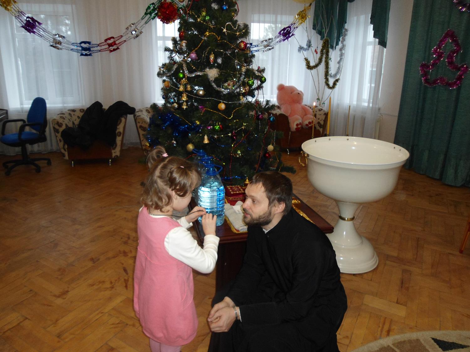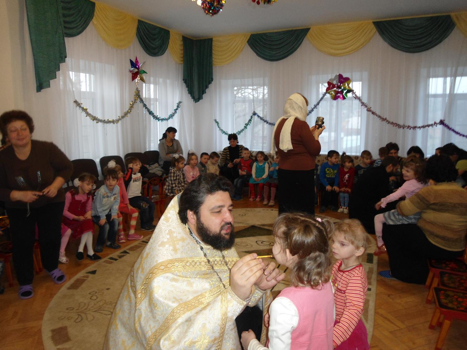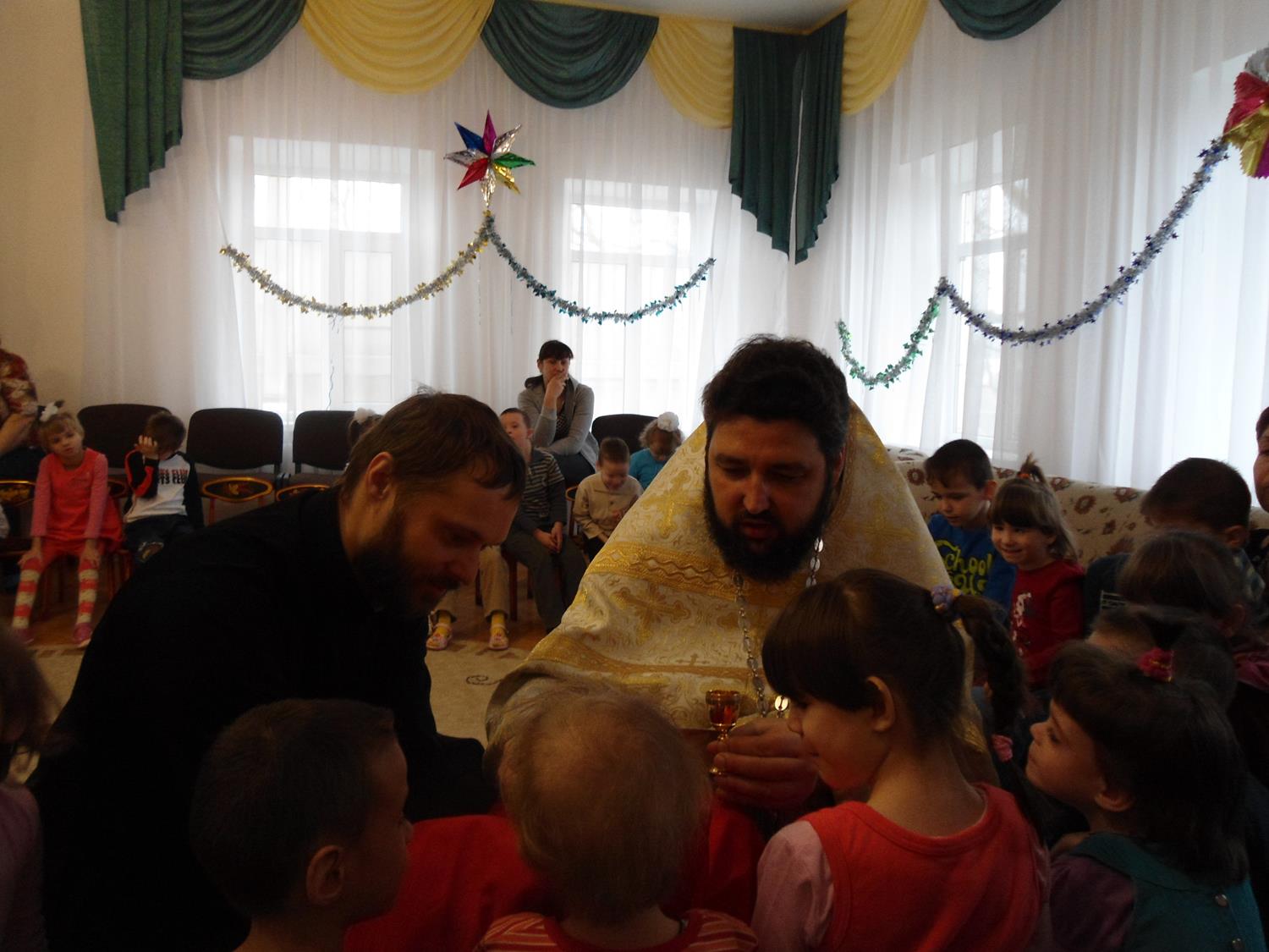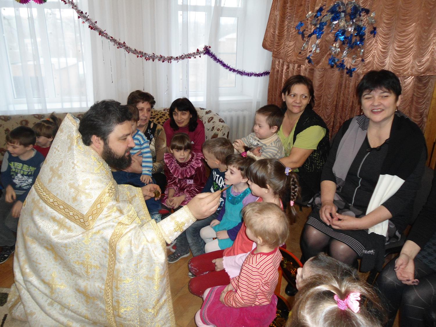 Поездка в детский дом была организована сестрами милосердия, которые уже третий год посещают этот детский дом, чтобы подарить брошенным деткам частицу своего внимания и любви. В этот раз были крещены трое новых воспитанников детского дома и все детки причастились Святых Христовых Таин. По совершении Таинства Причастия отец Валерий поздравил всех с праздником и вручил подарки.