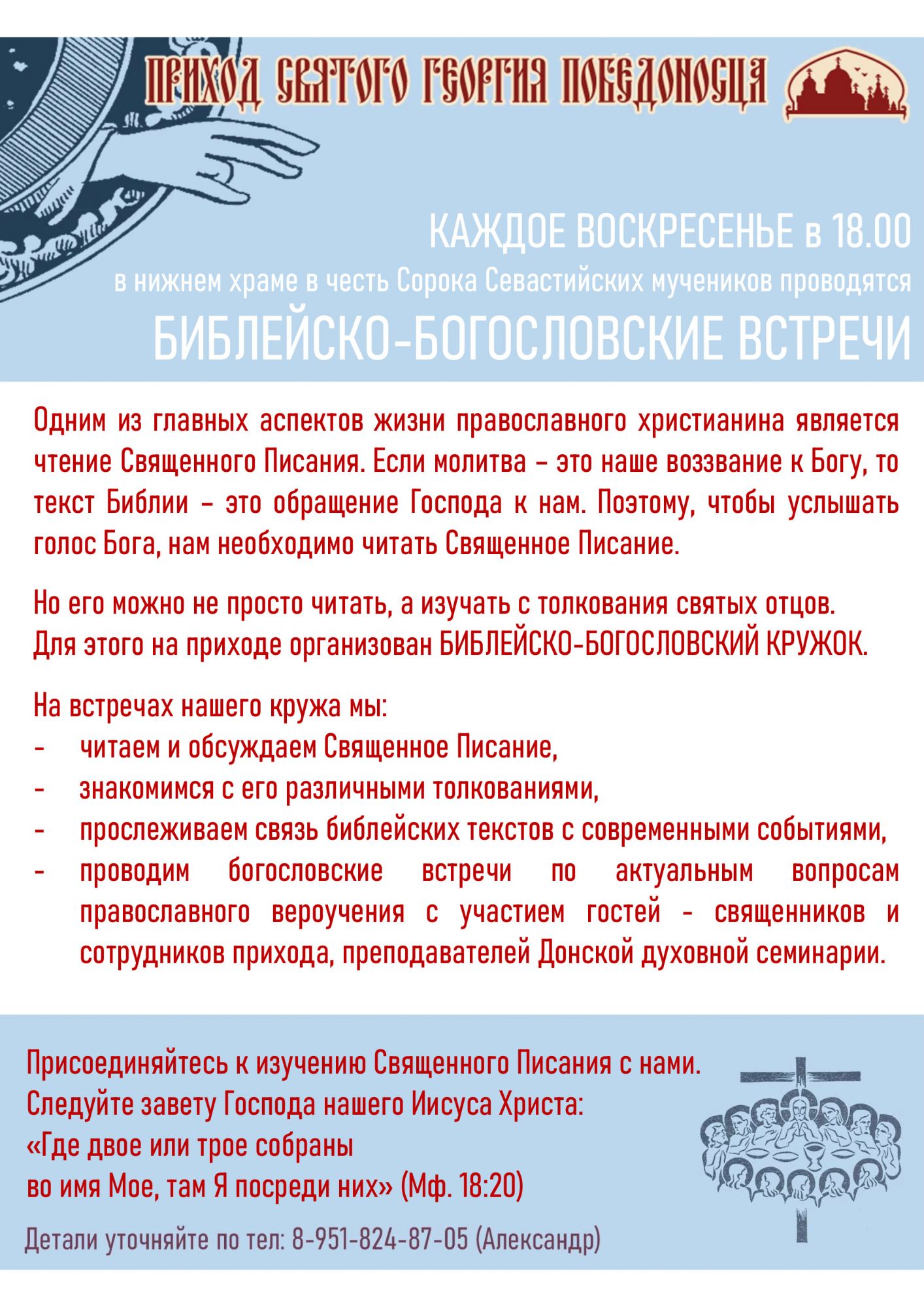 Но его можно не просто читать. Гораздо интереснее изучать Священное Писание. С этой целью на приходе Святого Георгия Победоносца по благословению настоятеля протоиерея Валерия Волощука организован библейско-богословский кружок. Его собрания проходят по воскресеньям в 18.00 в трапезной нижнего храма в честь Сорока Севастийских мучеников. Мы читаем и обсуждаем Священное Писание, знакомимся с его различными толкованиями, прослеживаем связь библейских текстов с современными событиями.