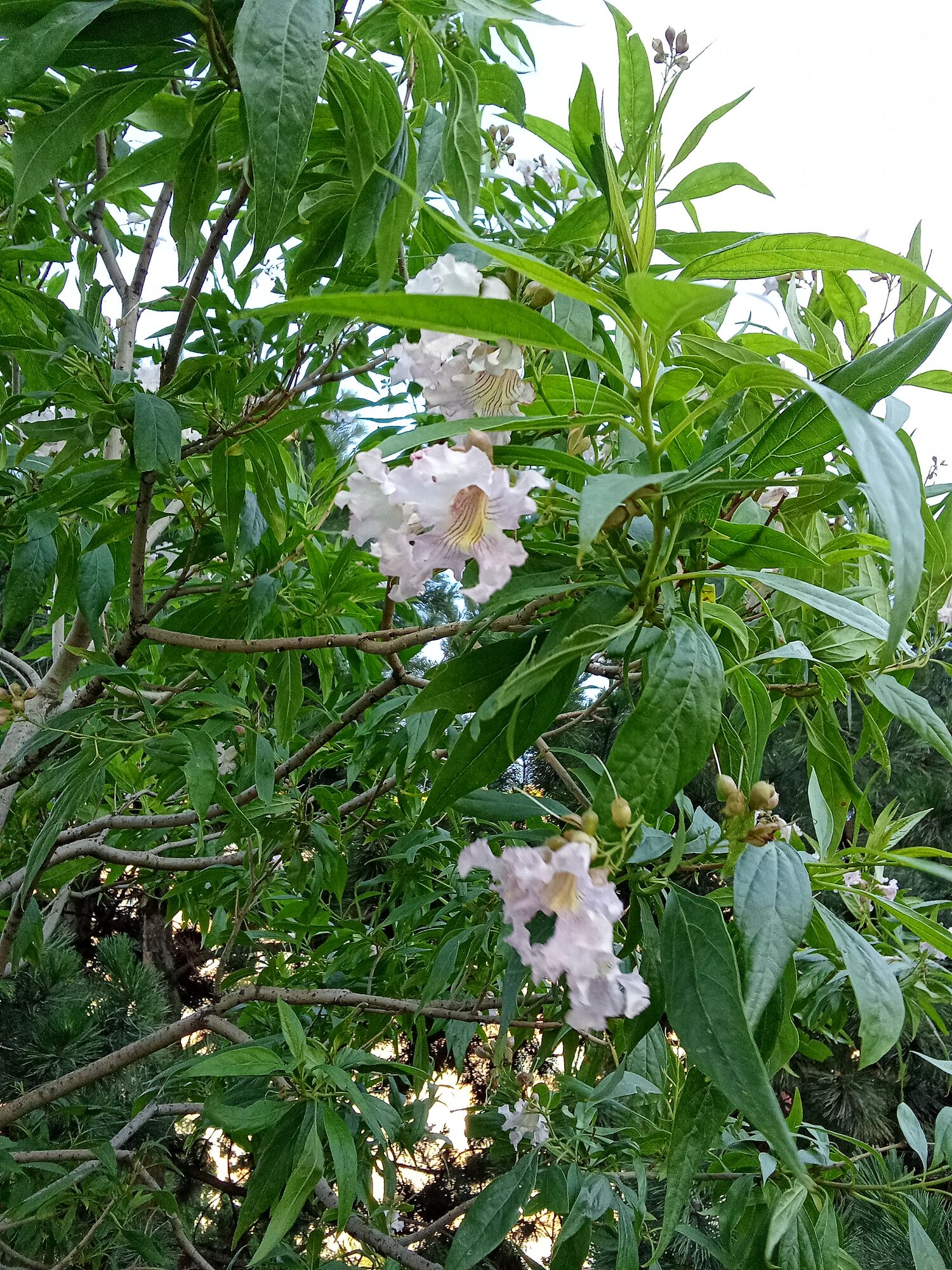 Описание: Гибрид, полученный с помощью перекрёстного опыления хилопсиса линейного и катальпы бигнониевидной в 1964 году ботаником Николаем Фёдоровичем Русановым в ботаническом саду Ташкента. Небольшое дерево, может достигать 4-6 метров в высоту. Сочетает в себе декоративные свойства хилопсиса с неприхотливостью катальпы. Листья тёмно-зелёные, ланцетовидные, длиной до 22 сантиметров и шириной от 4 до 5 сантиметров. Имеет очень долгий период цветения - с июня (в Узбекистане - с апреля) до первых заморозков. Цветы собраны в метельчатые соцветия, от 12 до 20 сантиметров в длину. Плоды - зеленые бобы-стручки.