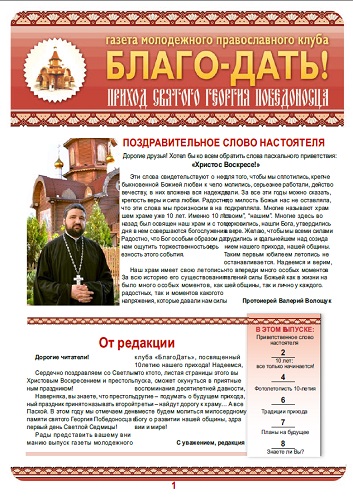 К престольному празднику прихода святого Георгия Победоносца участники молодежного клуба "Благо-Дать" подготовили специальный выпуск газеты, посвященный 10-летию прихода.