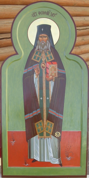 Сама икона написана необыкновенно. В таких цветах, композициях в нашем храме нет икон. Цвет фона, на котором изображен святитель – зеленый. Он является отголоском Духа Святого. Вспомним праздник Троицы: храмы наполнены зеленью и ароматами. Они как бы напоминают нам о том, что церковь Божия дышит особым ароматом – Духом Святым. По слову Серафима Саровского, главная задача человека, а уж тем более монаха – стяжание благодати Духа Святого. Зеленый цвет фона утверждает и подчеркивает: всей своей жизнью Феофан Затворник стяжал благодать Духа Святого.