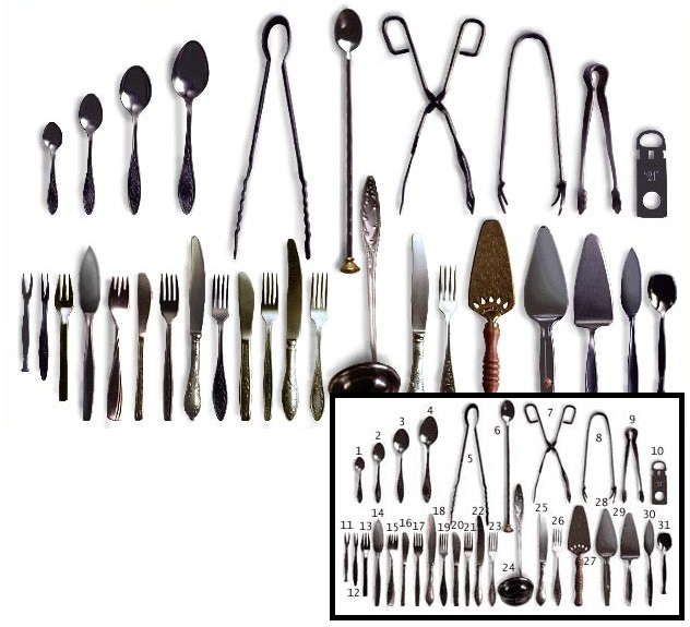 Столовые приборы принято разделять индивидуальные (те, что описывались выше) и на вспомогательные. Столовых приборов (в европейской традиции) существует большое разнообразие. Вот лишь некоторые из наиболее распространённых - рисунок 3.