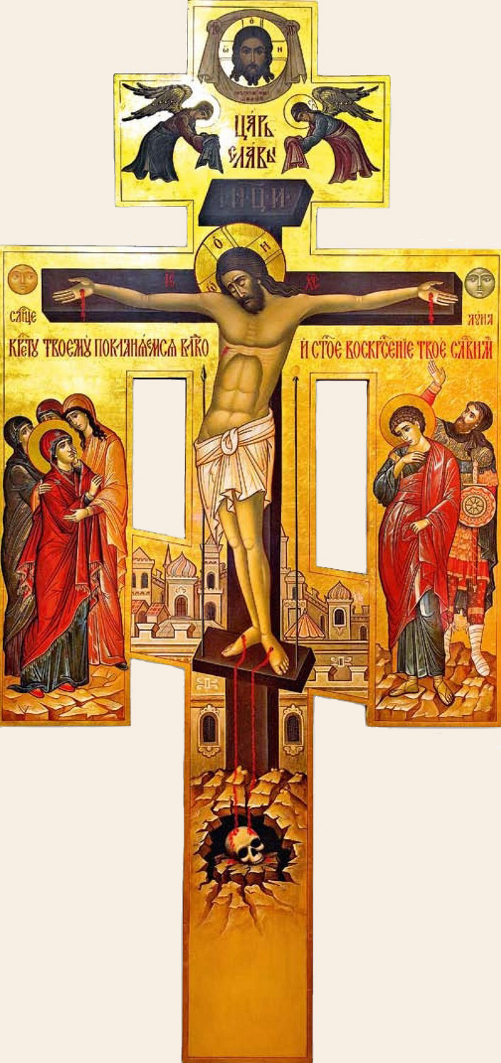За основу эскиза креста-распятия взяты образцы литейных латунных крестов с цветной эмалью XVII – XVIII вв. Восьмиконечный крест с образом Христа имеет четкую иконографическую схему. Композиция распятия передает евангельское повествование о Голгофских событиях. В центральной части – Иисус Христос с предстоящими с одной стороны Богородицей, Марией Клеоповой и Марией Магдалиной, с другой - Иоанном Богословом (любимым учеником Христа) и сотником, который «видев происходившее, прославил Бога и сказал: истинно человек этот был праведник» (Лк. 23, 47).