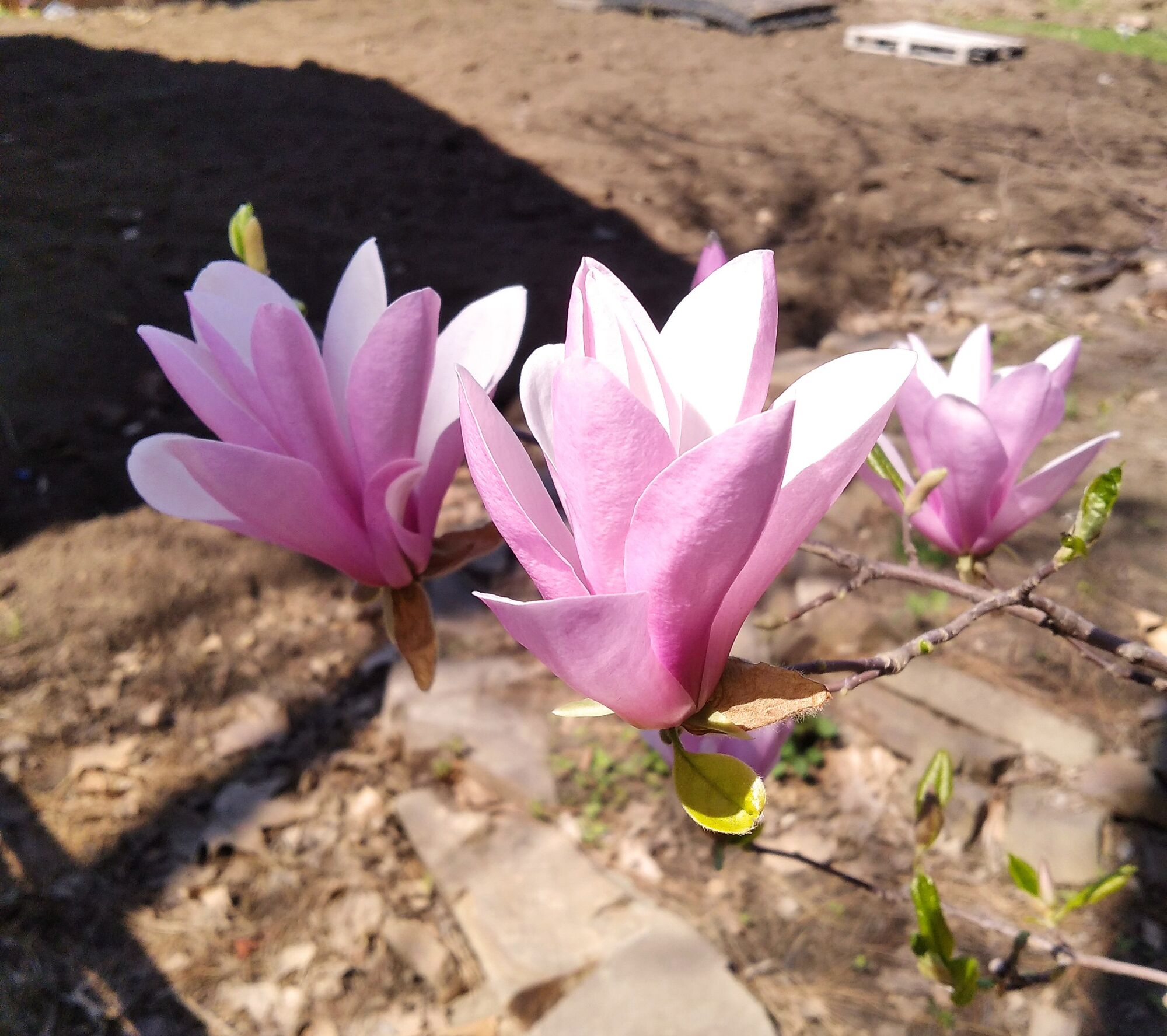 Описание: Листопадное невысокое дерево или кустарник высотой от 2-3 м до 8 м, с круглой кроной. Листья большие светло-зеленые. Цветки чашевидные очень крупные, размером до 25 см. Цвет варьирует от чисто-белого (magnolia Lennei) до двухцветного (magnolia Alexandrina). Цветение в апреле - мае. Вид был выведен Этьеном Суланжем в 1820 году во Франции.