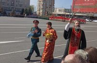 В День Победы настоятель нашего храма — Главного храма Южного военного округа благословил парадные расчёты перед их торжественным прохождением по Театральной площади