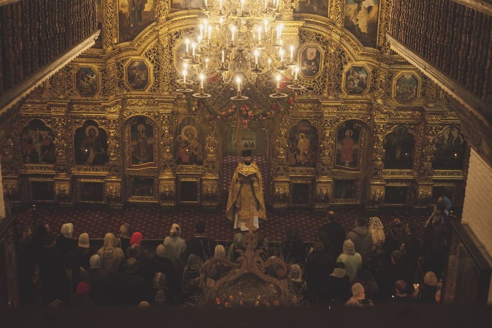 Этим определяется и характер внутреннего освещения храма. Оно никогда не назначалось для того, чтобы было светло. Светильники храма всегда имели духовно-символическое значение. Они возжигаются и днем, во время дневных служб, когда света из* окон достаточно для общего освещения. В уставных случаях церковные светильники во время вечерних и ночных богослужений могут возжигаться в очень небольшом количестве, а при чтении шестопсалмия на всенощном бдении положено гасить все свечи, кроме свечи в середине храма, где стоит чтец, пред иконами Христа, Богоматери и храма в иконостасе. Сумрак в храме становится очень густым. Но полного мрака не бывает никогда: "Свет во тьме светит". Зато при праздничных и воскресных богослужениях по чину возжигаются все светильники, в том числе и верхние - паникадило и поликандила, создавая образ того полного света Божия, который воссияет верным в Царстве Небесном и содержится уже в духовном значении празднуемого события.