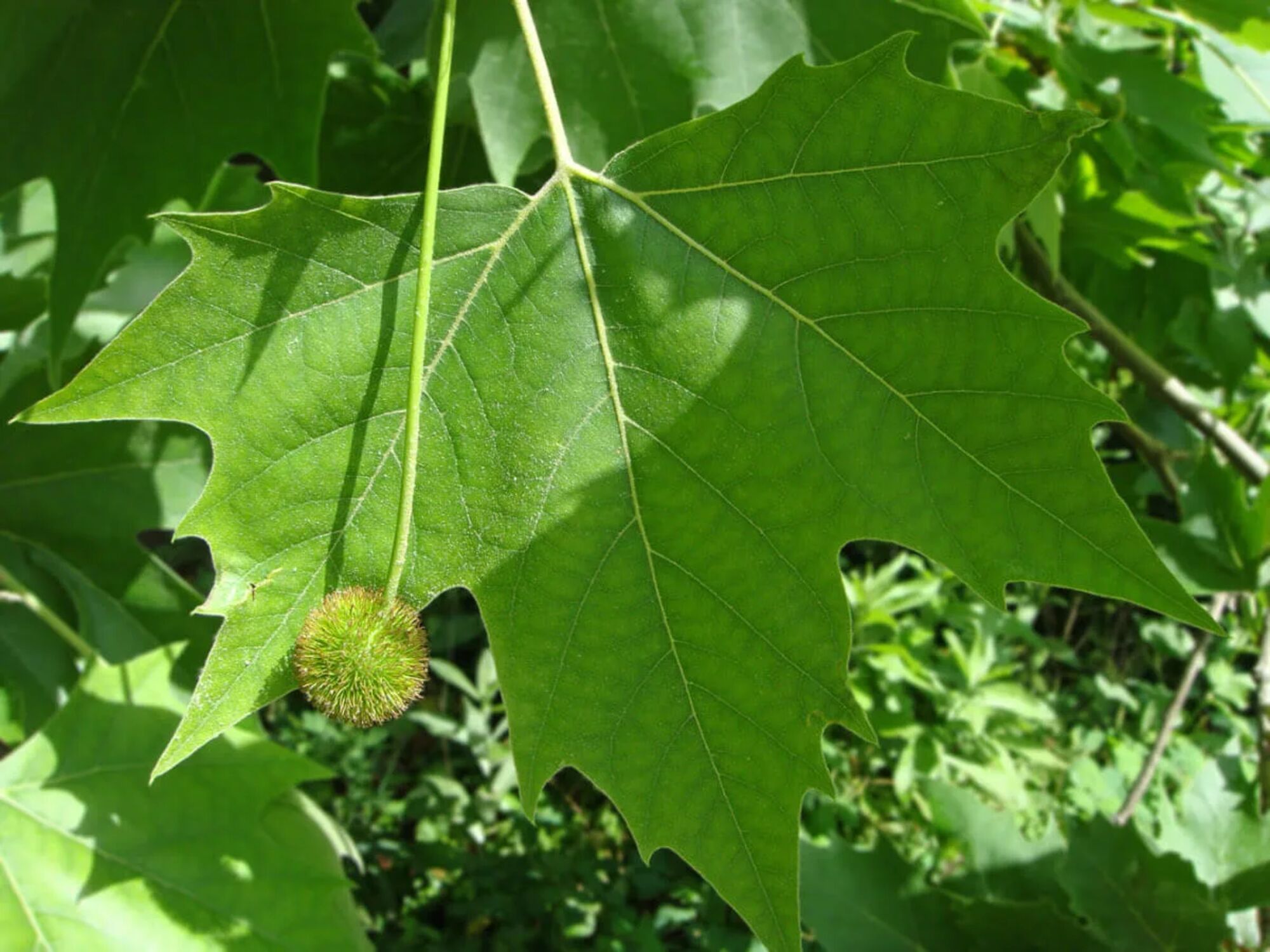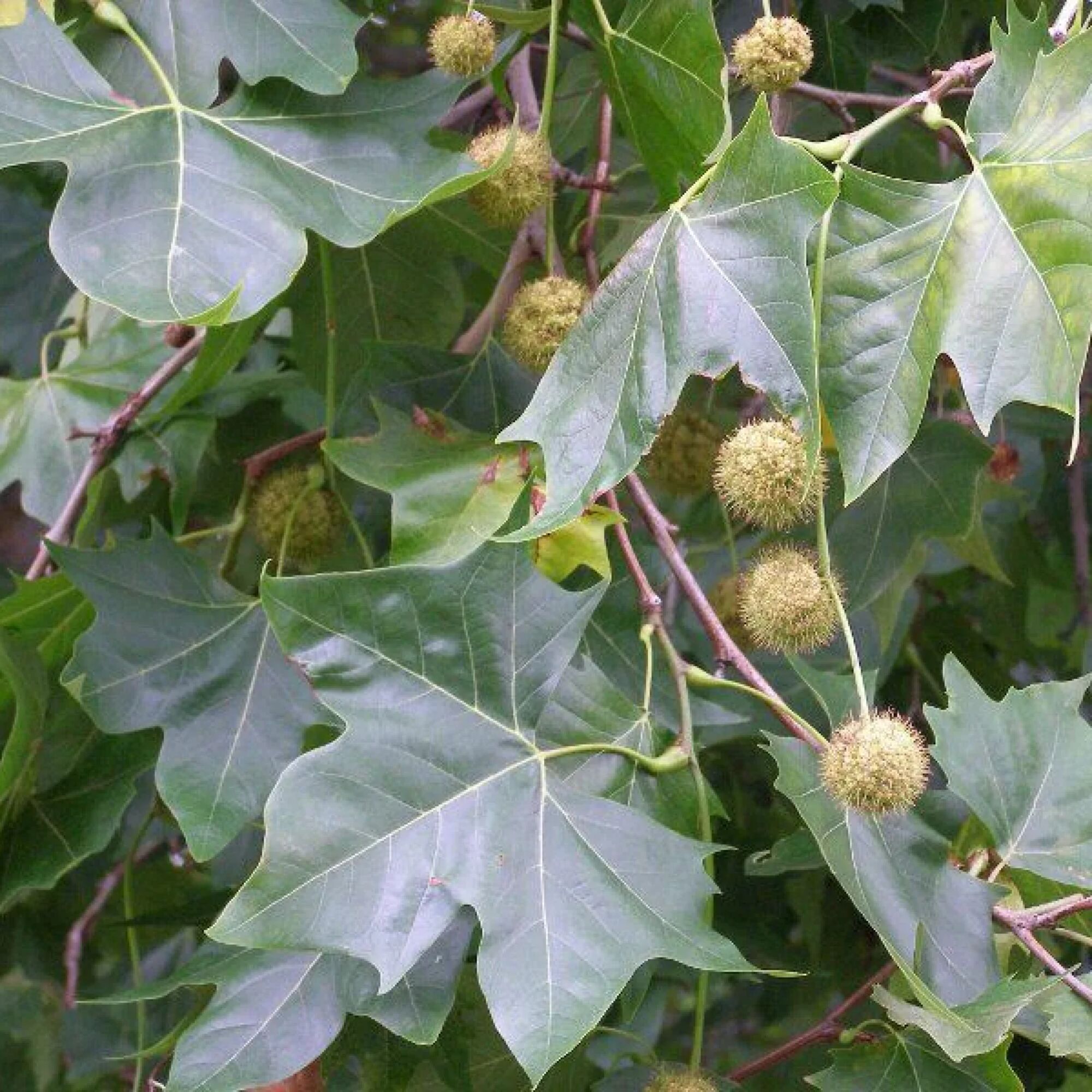 Описание: Гибридный вид деревьев рода платан высотой до 40м с прямым высоким стволом и довольно широкой раскидистой кроной с повисающими нижними ветвями. Кора на стволе отделяется крупными пластинками. Листья длиной 15-17см, в основном пятилопастные. Плодовые головки диаметром около 3 см, щетинистые, обычно по две, редко одиночные или по три. Семянки опушённые, с широко-конической голой верхушкой и долго сохраняющимся столбиком.