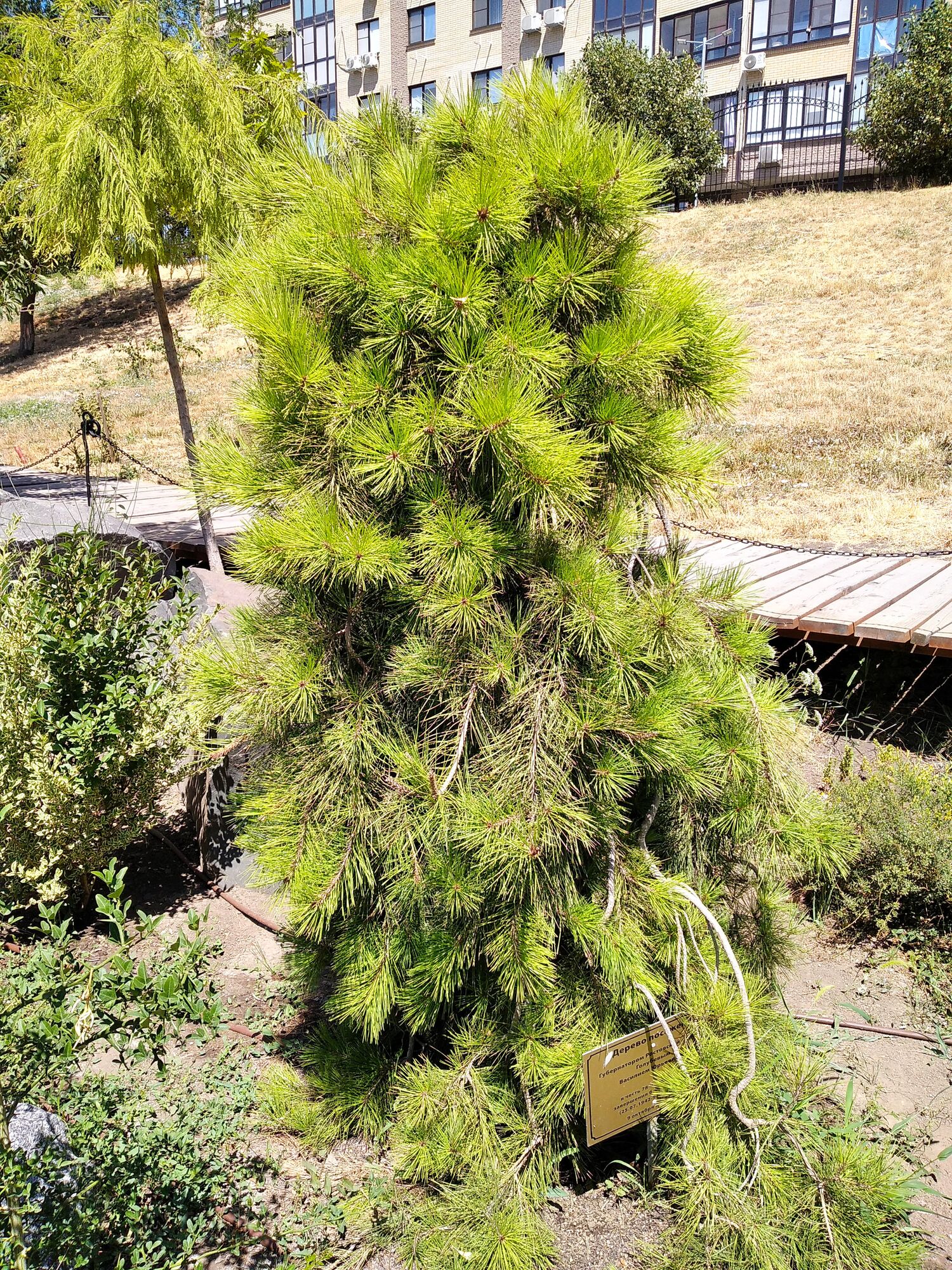 Описание: Невысокое (до 5 метров) плакучее дерево, которое привлекает внимание необычной для хвойных растений формой кроны. Оно выглядит очень нежно и даже романтично. Хвоя у растения немного жесткая, растёт по несколько иголок в одном пучке. Кора — буро-золотистая. Узкие шишки конической формы длиной более 10 сантиметров, окрашенные в светло-коричневый цвет с нежно-фиолетовым оттенком, появляются на пятый год. Неповторимая форма густой кроны никого не оставит равнодушным.