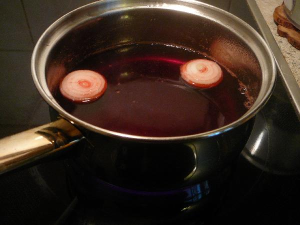 Отвар процеживаем через сито. Жидкость отправляем обратно в кастрюлю. Кидаем в него половинки луковицы, опять доводим до кипения и варим 1-2 минуты на среднем огне, не накрывая крышкой. (Тем временем,пока никто не видит, жадно хомячим ложкой то, что осталось в сите, и с довольными лицами готовим дальше =))