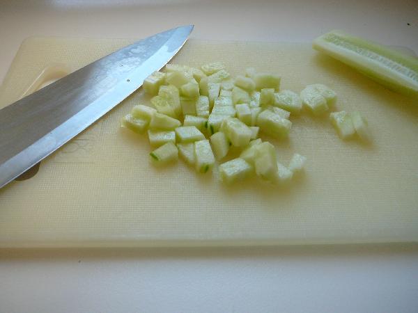 Делаем огонь минимальным, убираем луковицу, добавляем зелень, солим, перчим (любители остренького могут кинуть небольшой стручок красного перца, потом его надо вынуть). Закрываем крышкой и даем настояться минут 5-7. Пока супчик настаивается, чистим и режем огурцы маленькими кубиками (или трем на крупной терке). Измельчаем в блендере грецкие орехи до небольшой крошки.