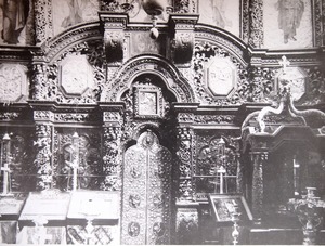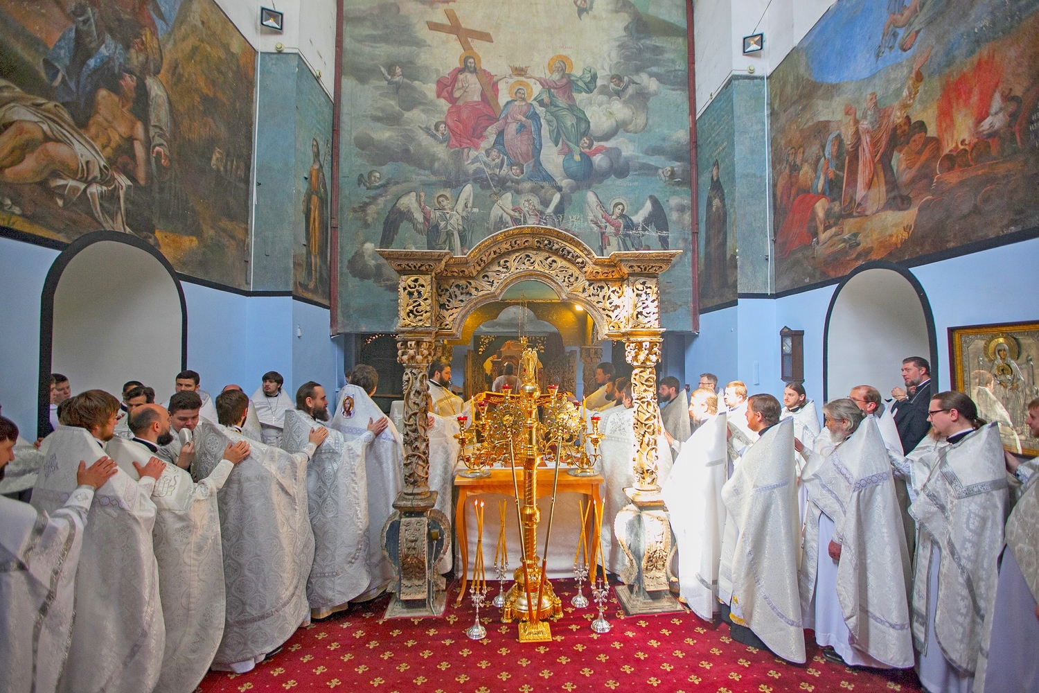 Алтарь. Стены в алтаре были расписаны в 1784 году послушником Киево-Печерской Лавры, а затем диаконом собора Филиппом Симановичем. В надвратной части — большая икона Коронации Богородицы. Данный пришедший из католичества сюжет получил распространение в России в эпоху правления Екатерины II.