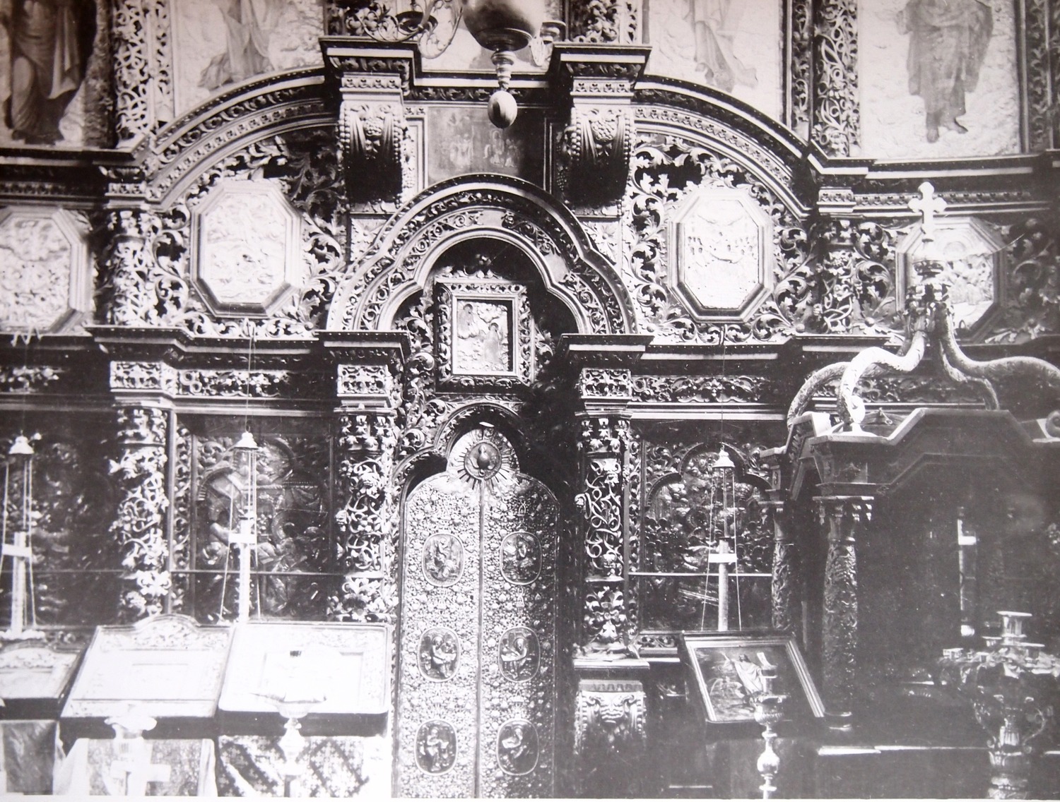 Иконостас. Уникальный пятиярусный резной позолоченный иконостас Войскового Воскресенского собора со ста сорока девятью иконами XVIII-XIX веков - единственное в своем роде произведение искусства на Дону и Юге России. Новый иконостас был создан вскоре после пожара 1744 года, в котором погибла практически вся церковная утварь. Грандиозный комплекс шириной 23м и высотой 19м имеет необычную структуру: помимо традиционных пяти рядов — праотеческого, пророческого, деисусного, праздничного и местного — иконостас венчает сокращённый Страстной ряд с тремя резными изображениями Распятия Христова над каждым приделом, а в нижней части располагаются иконы тумбового ряда (иначе его называют «подместным»), который состоит не только из прямоугольных композиций, находящихся под иконами местного чина, но и из круглых и прямоугольных живописных вставок на консолях иконостаса.