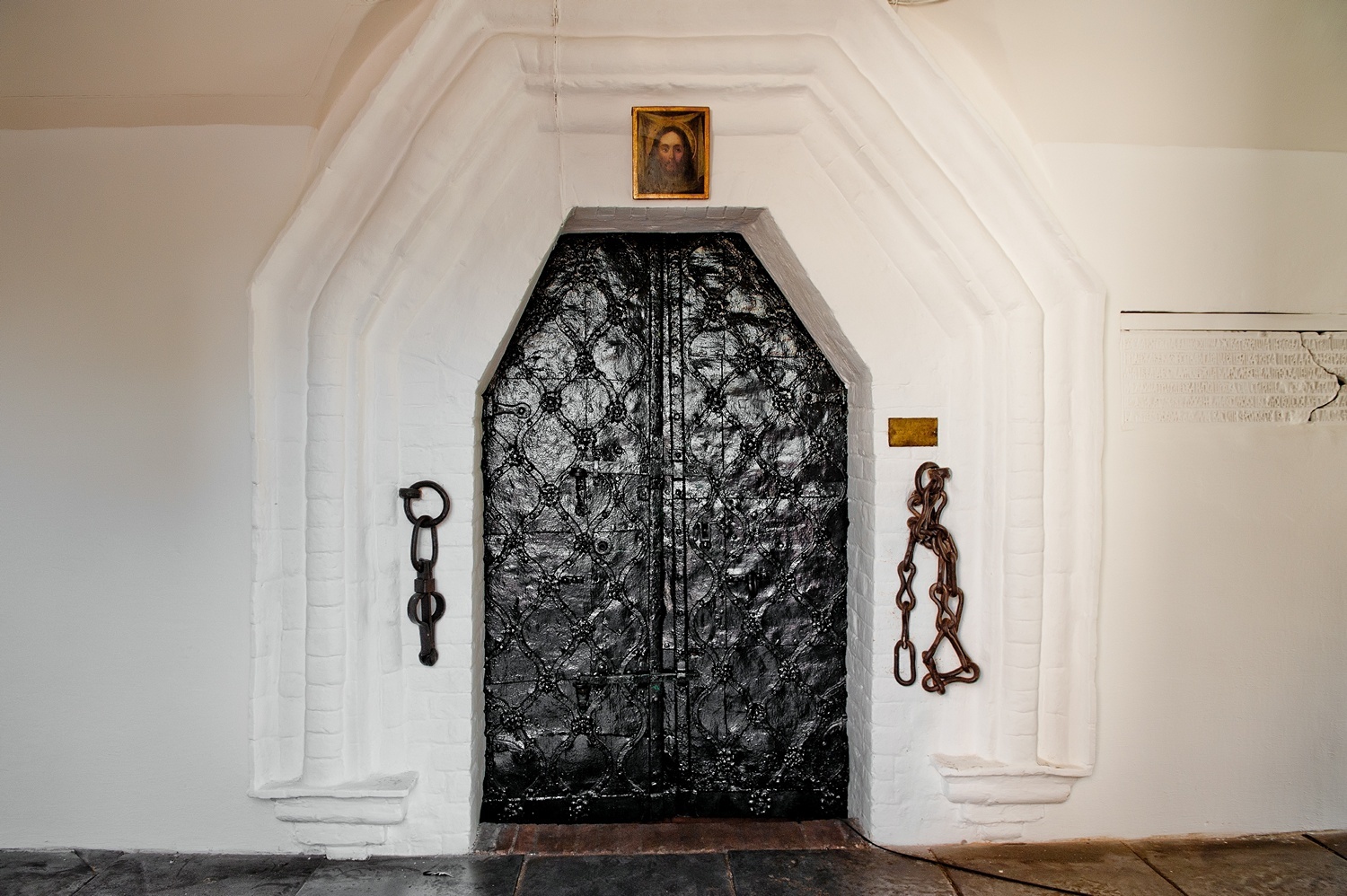 Цепь Разина. Перед западным входом в собор накрепко вмурованы в стену собора кандалы и железная цепь, которой был прикован Степан Разин. После пиратских грабежей торговых кораблей на Каспийском море в 1669 году Разин прельстил многих в Астрахани и на Дону богатой добычею, вольною жизнью и будущим блаженством, для коего не нужны будут ни подати, ни начальники. Все, недовольные чем-либо, шли под его знамена. А недовольных в те времена было множество. Виноваты проведенная силой, а не убеждением, церковная реформа патриарха Никона и вынужденное повышение налогов в годы русско-польской войны 1654—1667 годов. Грабежи, беззаконие, предательства и убийства распространились по всей России. Множество бездомных, дворовых людей, гуляк, бродяг, выпущенных из тюрем преступников, скрывавшихся по лесам, вместе с донцами и стрельцами составляли толпу, простиравшуюся до 200.000 головорезов. Разин, для поддержания брожения умов и обмана народа, рассказывал, будто на одном его струге сидит за год до того умерший Царевич, Алексей Алексеевич, а на другом – низверженный Патриарх Никон. Вместо Царевича иногда показывали мальчика лет шестнадцати, сына какого-то Черкесского Князя. Народ всему верил, чему верить хочется, и раздельными своими толпами, большей частью безоружными, без порядка и начальников производил величайшие злодеяния, убийства и опустошения; предавал огню и мечу сопротивлявшиеся города, разрушал усадьбы, мельницы и разные заведения, грабил Царскую казну, церкви, монастыри, купеческие караваны.