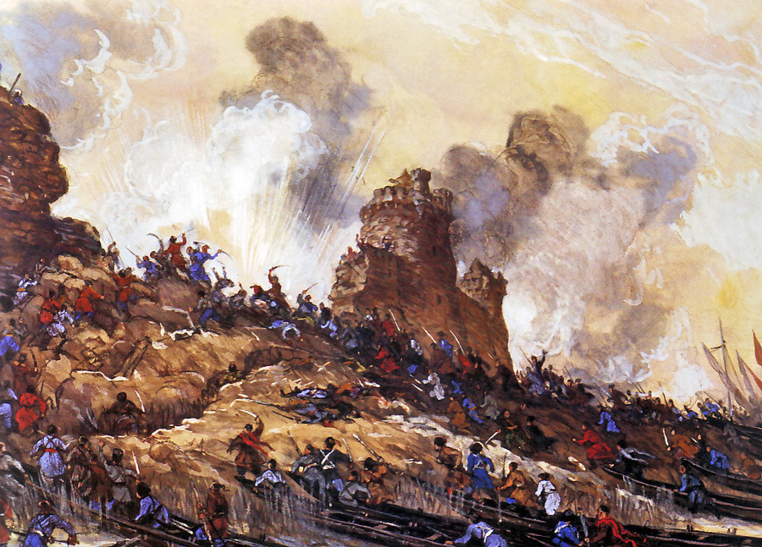Знамена внесли и уже ликовали о бесспорной победе. И в это время центральная часть площади «Топракова-города» взорвалась! Страшный по мощи фугас, начиненный рубленными железными прутьями, буквально разнес на куски все передовые, наиболее решительные батальоны янычар. Мгновенно погибло не менее трех тысяч солдат. Возникла паника. В этот ключевой момент казаки дружно бросились в решительную контратаку. Позднее казаки признавались, что «окромя большого приступа первого, такова жестокого и смелого приступа не бывало к нам: ножами мы с ними резались, лицо на лицо, в тот приступ».