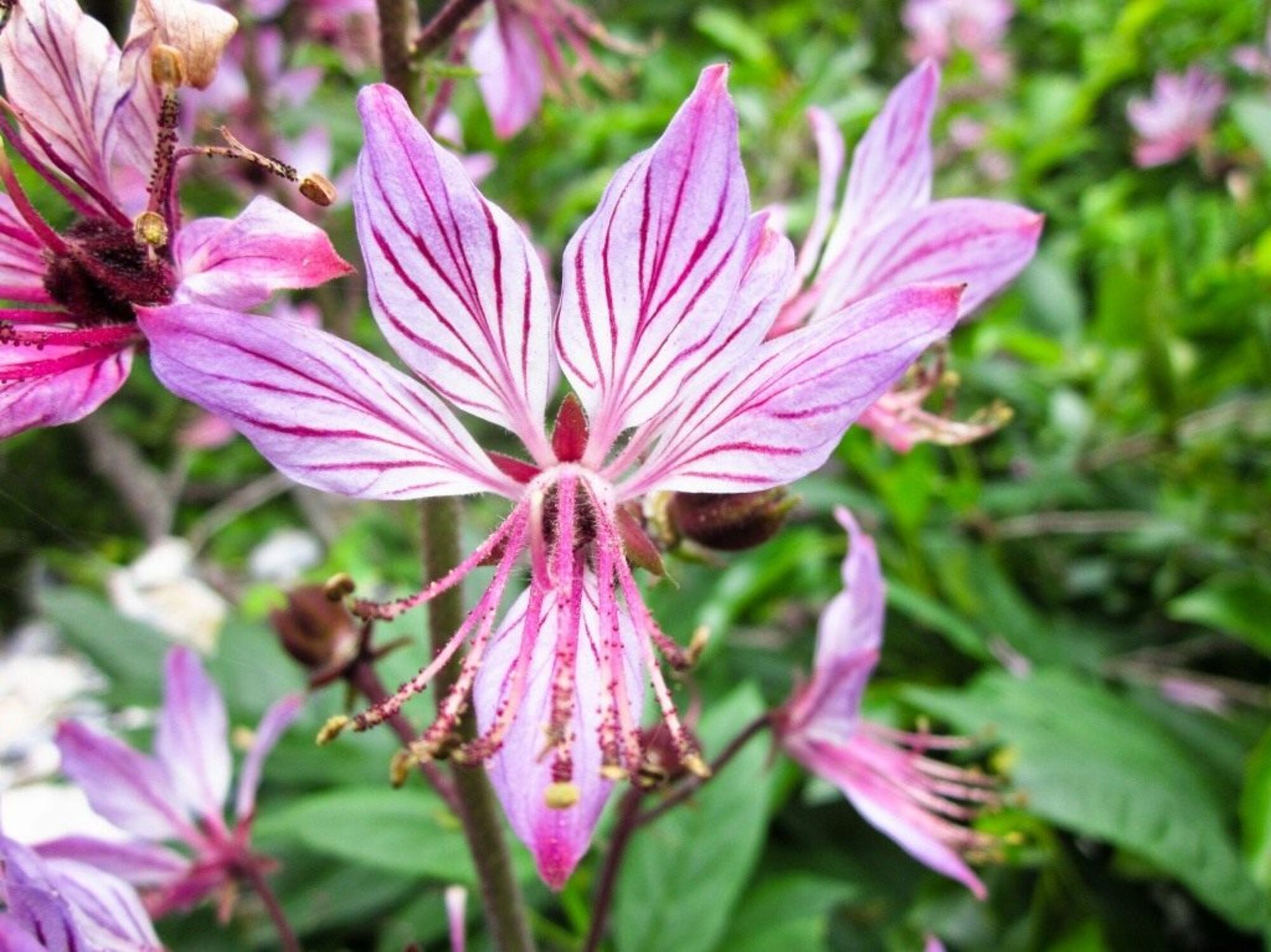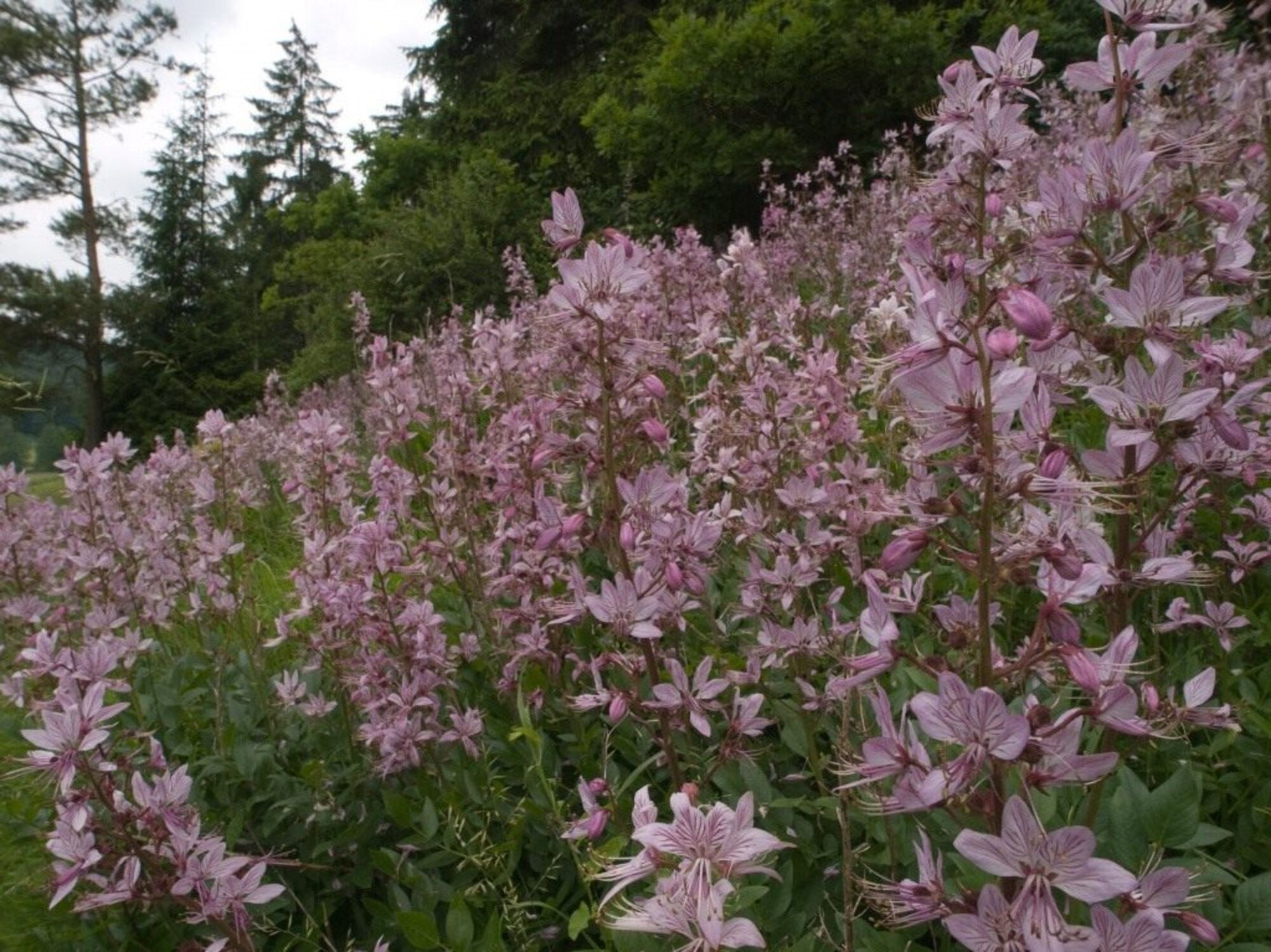 Описание: Стройный и компактный куст, листья не парноперистые, на длинных черешках. Цветки крупные, розовые, неправильной формы, с приподнятыми вверх лепестками; собраны в рыхлое метельчато-кистевидное соцветие до 20-25 см длиной. Цветет в июне-июле. Ясенец – это опасное для человека растение, если прикоснуться к нему в жаркий летний день, можно получить серьезные химические ожоги кожи. Также ясенец нельзя нюхать, иначе ожогов слизистых оболочек также не избежать. Цветущий ясенец выделяет эфирные масла, концентрация которых в в жаркую сухую погоду рядом с кустом бывает настолько высокой, что может вспыхнуть огонь — от солнечных лучей или случайно брошенной спички. Эфирные масла быстро сгорают, при этом сам куст остается нетронутым. Название «ясенец» растение получило за сходство своих листьев с листьями ясеня.
